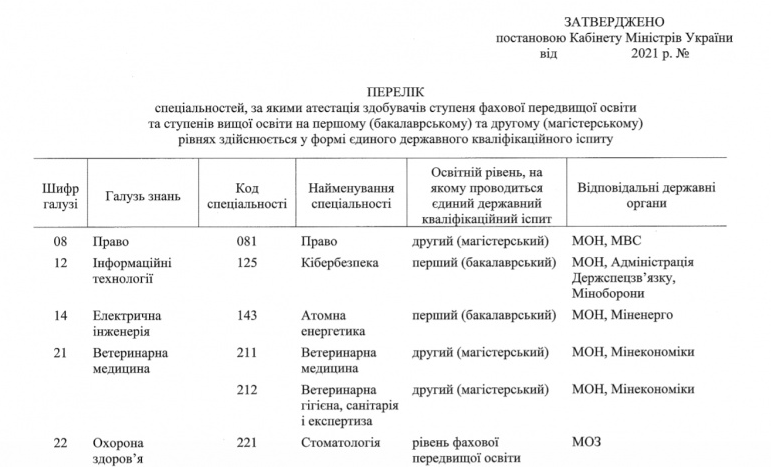 Кабинет министров на заседании принял постановление о создании единого государственного экзамена для бакалавров и магистров. Правительство также утвердило перечень специальностей, которые должны будут сдавать этот экзамен, передает FaceNews.ua.