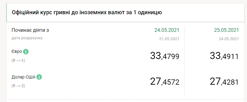Национальный банк Украины на вторник, 25 мая, укрепил курс гривны почти на 2 копейки по отношению к доллару и на копейку ослабил к евро, передает FaceNews.ua. Об этом свидетельствуют данные на сайте НБУ.