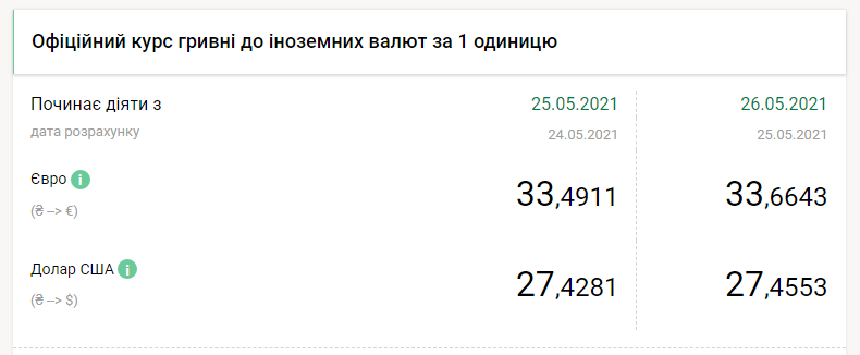 Национальный банк Украины на среду, 26 мая, ослабил курс гривны на 2 копейки по отношению к доллару и сразу на 17 копеек к евро, передает FaceNews.ua. Об этом свидетельствуют данные на сайте НБУ.