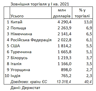 По данным статистического ведомства, на второе место вышла Польша (2 263,9 млн долларов, 6,9%), которая ранее занимала четвертое место. На третьем по-прежнему Германия (2 141,4 млн долларов, 6,5%).