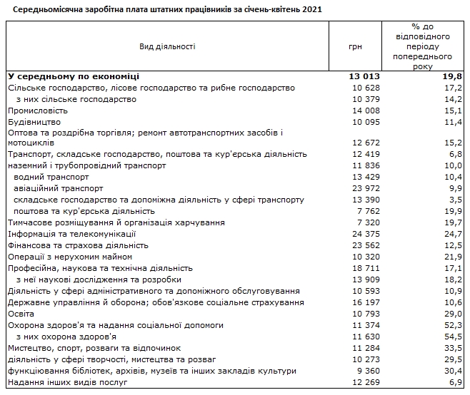 Среднемесячная заработная плата штатных работников за январь-апрель 2021 года составляла 13 013 гривен. По сравнению с соответствующим периодом предыдущего года зарплата выросла на 19,8%, передает FaceNews.ua.