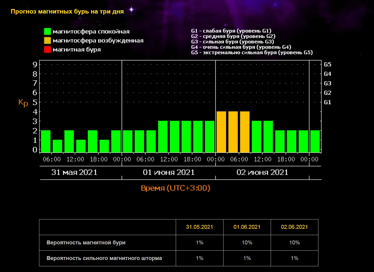 Согласно ожиданиям астрономов, вероятность возникновения серьезной магнитной бури в этот день составляет 10%, а сильного магнитного шторма – 1%. Аналогичной ситуация будет и 1 июня.