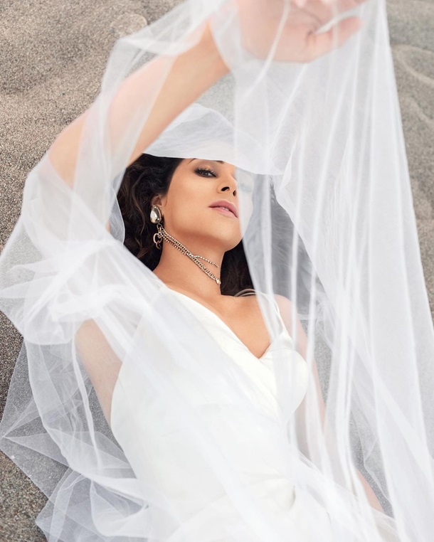 Злата предстала в длинном белом платье на тонких бретельках с обольстительным вырезом на ноге. Она позировала босиком на пляже.