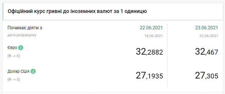 Нацбанк обновил курсы валют на 23 июня 2021 года, передает FaceNews.ua. Новый курс валют опубликован на сайте регулятора во вторник, 22 июня.