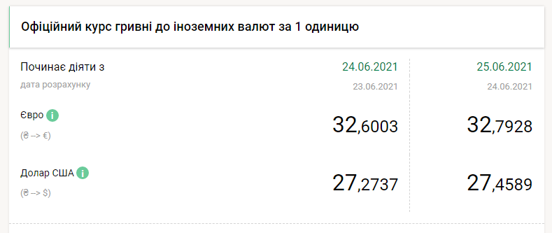 Официальный курс гривны к доллару на 25 июня установлен на таком уровне: 27,4589 гривен за 1 доллар (+0,1852 грн). При этом курс доллара на 24 июня составляет: 27,2737 гривен за 1 доллар.