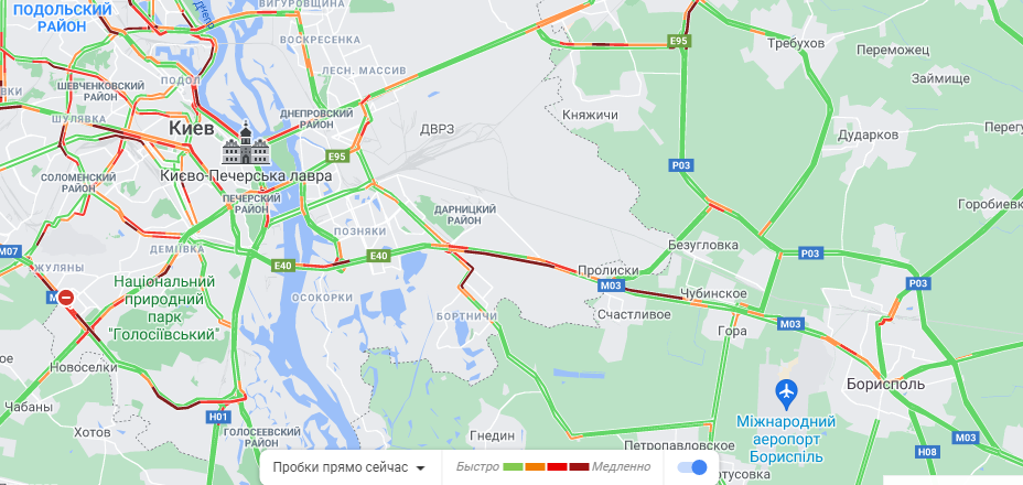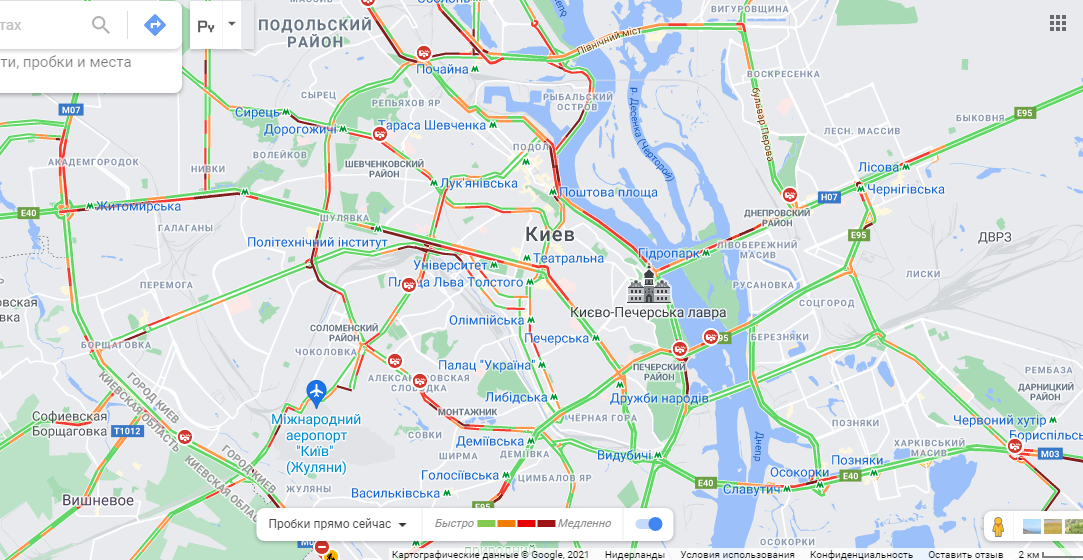 По данным онлайн-сервиса Google Maps, на правом берегу пробки наблюдаются на проспектах Любомира Гузара, Лобановского, Победы, Степана Бандеры, Голосеевском проспекте.