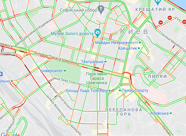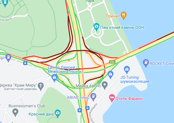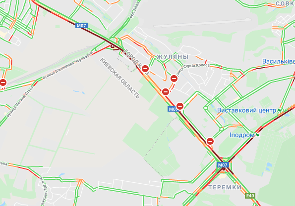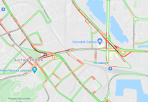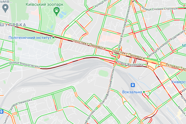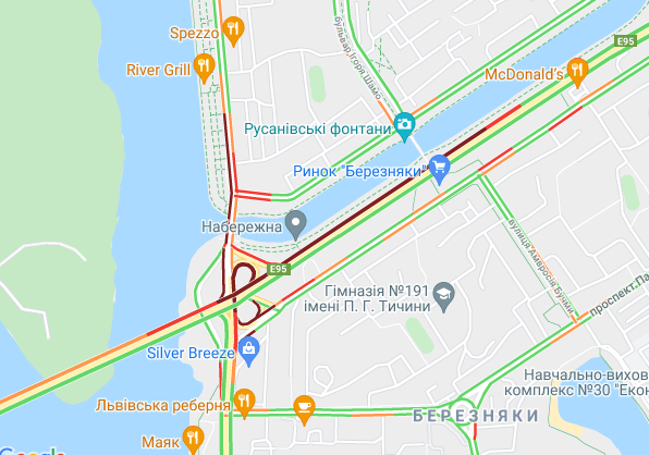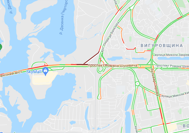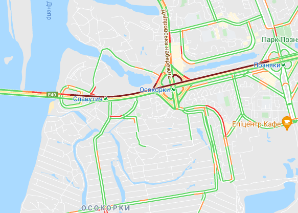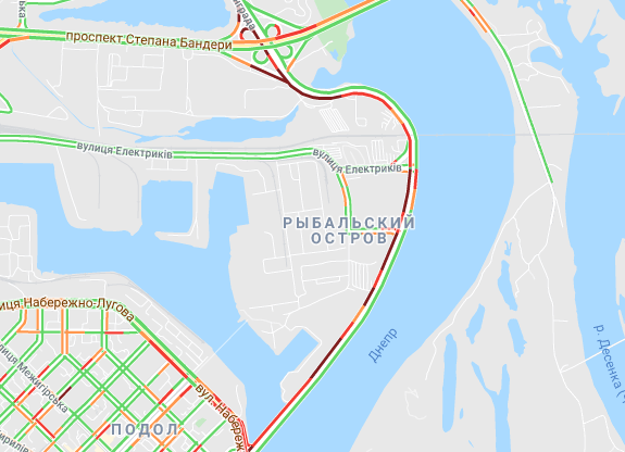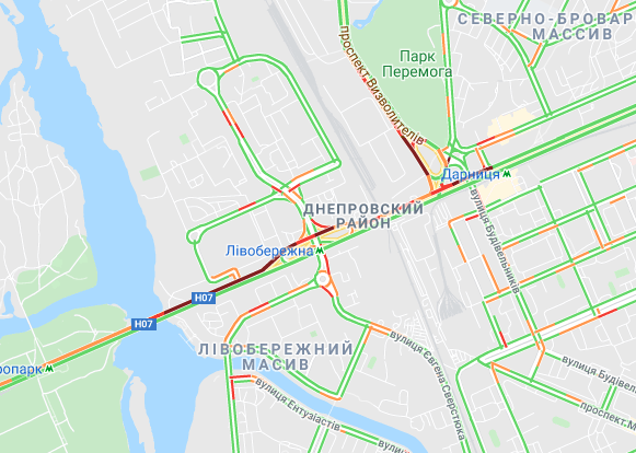 По данным онлайн-сервиса Google Maps, на левом берегу движение затруднено по проспекту Соборност, проспекту Романа Шухевича, проспекту Николая Бажана, ул. Оноре де Баьзака, возле станций метро "Дарница", "Левобережная", "Осокорки", "Позняки" и "Славутич".