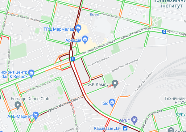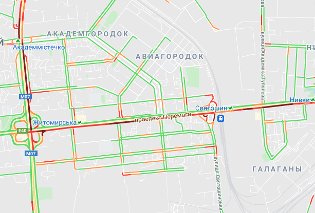 На правом берегу столицы пробки образовались по Кольцевой дороге, проспекте Степана Бандеры, ул. Семена Скляренко, ул. Елены Телиги, ул. Куреневская, ул. Вадима Гетьмана, ул. Кириловская, ул. Богатырская, по Набережному шоссе, по Набережно-Рыбальской, возле станций метро "Святошин", "Житомирская" и "Академгородок".