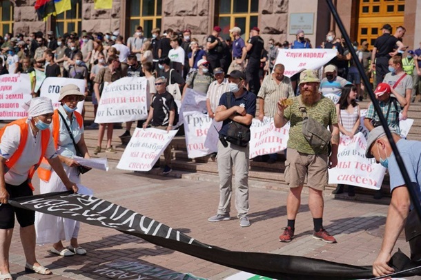Участники акции держат плакаты: "Зеленский, защити нас от Кличко", "Кличко + Белоцерковец = МАФовая мафия", "Белоцерковец грабит наши семьи", "Малый бизнес против Мафии Кличко" и другие.