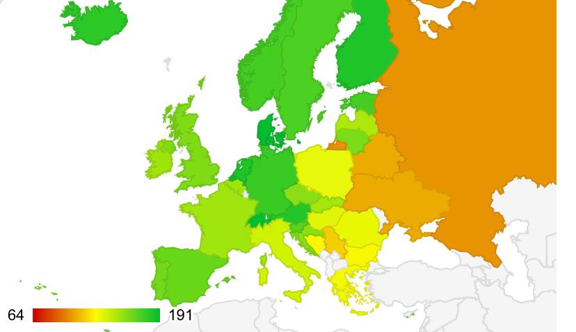 В топ-5 стран вошли Швейцария, Дания, Нидерланды, Финляндия, Австрия. Последние пять ступеней заняли Нигерия, Иран, Бангладеш, Кения, Филиппины.