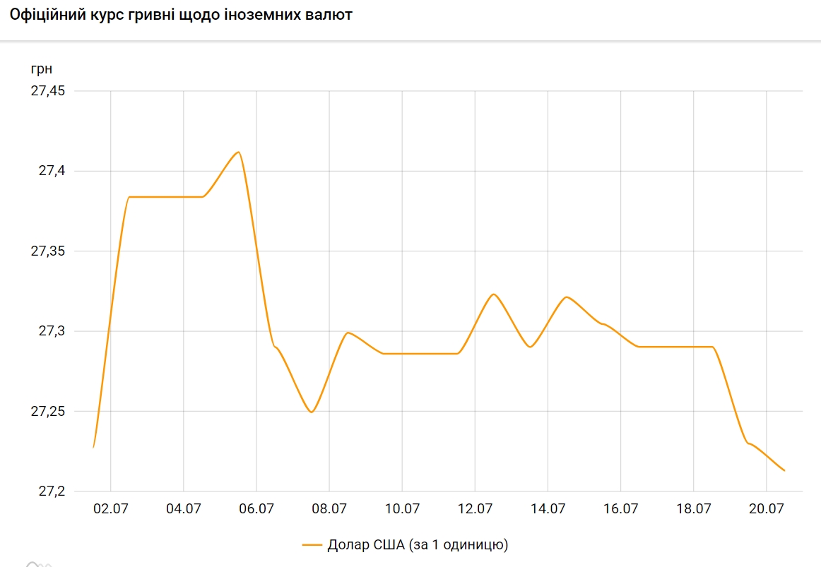 Как свидетельствуют данные на сайте регулятора, официальный курс гривны к доллару на 20 июля установлен на таком уровне: 27,2301 гривен за 1 доллар (-0,0169 грн). При этом курс доллара на 16 июля составляет 27,2132 гривен за 1 доллар