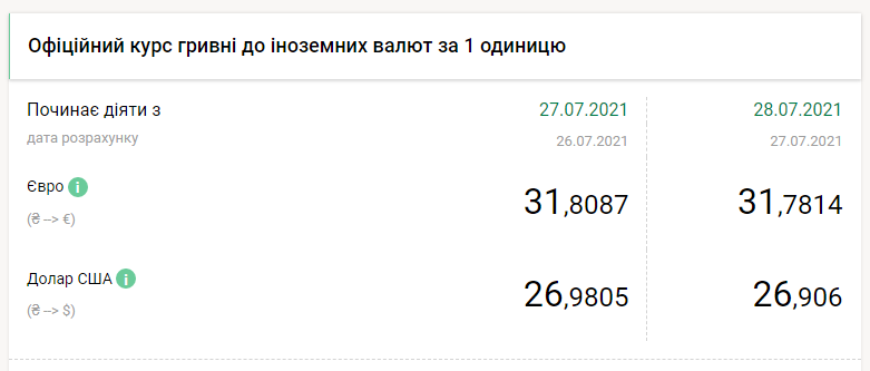 Национальный банк Украины на среду, 28 июля, укрепил курс гривны почти на 7,5 копеек по отношению к доллару и почти на 3 копейки к евро, передает FaceNews.ua. Об этом свидетельствуют данные на сайте НБУ.