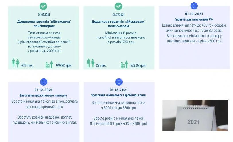 Согласно календарю, с 1 октября 2021 устанавливаются выплаты до 400 гривен лицам, которым исполнилось от 75 до 80 лет. Минимальный размер пенсионной выплаты составит 2500 грн.