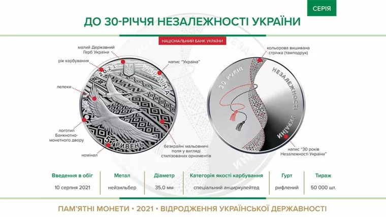 "[Монета] посвящена судьбоносному событию, произошедшему 30 лет назад, когда 24 августа 1991 года Верховный Совет Украины принял исторический документ – Акт провозглашения Независимости Украины", – сообщается на сайте НБУ.