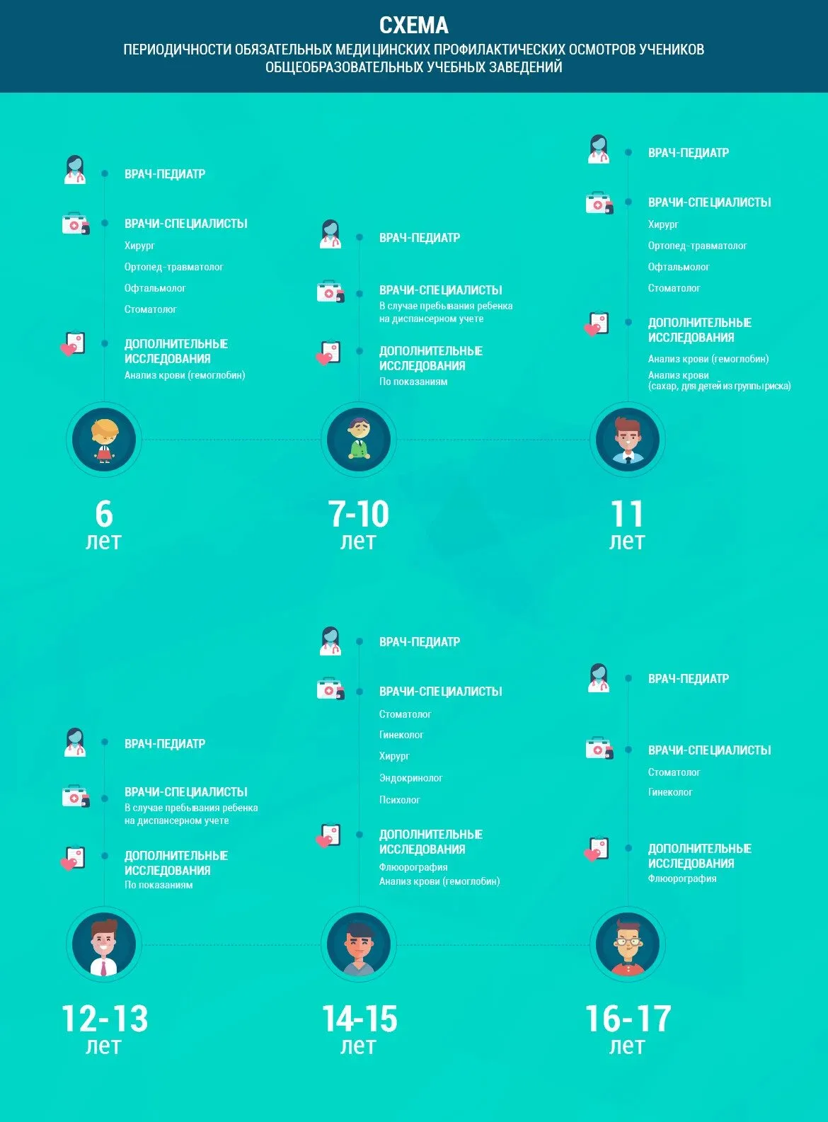 Отметим, что прохождение некоторых врачей зависит от возраста. Так, в 11 лет рекомендовано пройти хирурга, ортопеда-травматолога, офтальмолога и стоматолога. В 14-15 лет – стоматолога, гинеколога детского или подросткового, эндокринолога, хирурга, психолога (по показаниям). В 16-17 лет – стоматолога, гинеколога, флюорографию.