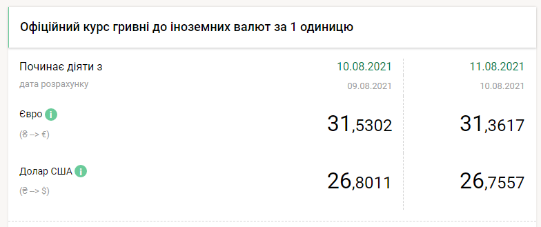 Национальный банк Украины на среду, 11 августа, укрепил курс гривны еще на 4,5 копейки по отношению к доллару и почти на 17 копеек к евро, передает FaceNews.ua. Об этом свидетельствуют данные на сайте НБУ.