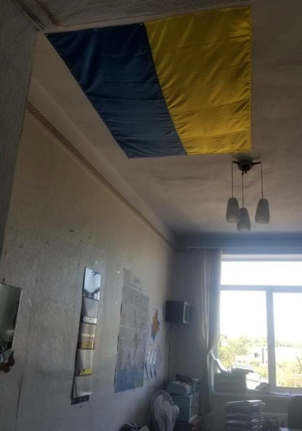 "Это фото сделано в одном из кабинетов Николаевской районной государственной администрации. Флагом закрыли дырку в потолке. Так и живем…", - написал он.