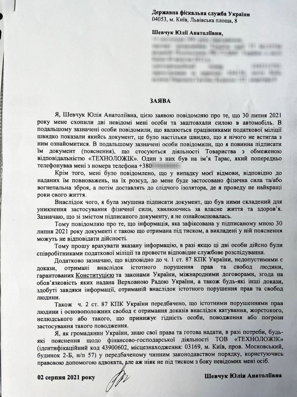 «Сообщаю, что информация, зафиксированная в подписанном мною документе 30 июля 2021 такова, что полученная под давлением, а изложенные в ней объяснения могут не соответствовать действительности. Поэтому прошу учесть указанную информацию, в случае если эти два человека действительно были сотрудниками налоговой милиции и провести соответствующее служебное расследование », - говорится в документе.
