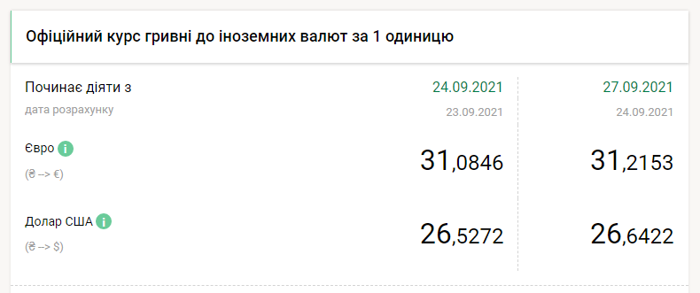 Национальный банк Украины на понедельник, 27 сентября, понизил курс гривны на 11,5 копеек по отношению к доллару и на 13 копеек к евро, передает FaceNews.ua. Об этом свидетельствуют данные на сайте НБУ.