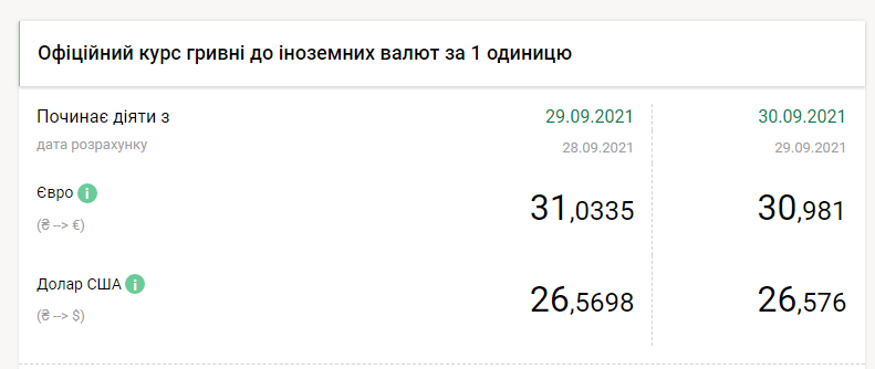 Национальный банк Украины на четверг, 30 сентября, понизил курс гривны менее чем на 1 копейку по отношению к доллару и укрепил более чем на 5 копеек к евро, передает FaceNews.ua. Об этом свидетельствуют данные на сайте НБУ.