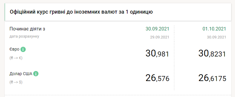 Национальный банк Украины на пятницу, 1 октября, понизил курс гривны на 4 копейки по отношению к доллару и укрепил почти на 16 копеек к евро, передает FaceNews.ua. Об этом свидетельствуют данные на сайте НБУ.