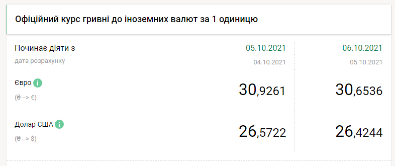 Национальный банк Украины на среду, 6 октября, укрепил курс гривны почти на 15 копеек по отношению к доллару и на 27 к евро, передает FaceNews.ua. Об этом свидетельствуют данные на сайте НБУ.