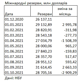 Размер международных резервов Украины в течение сентября 2021 года сократился на 2 909,29 млн долларов (на 9,2%). На 1 октября размер резервов составил 28 705,16 млн долларов, передает FaceNews.ua.