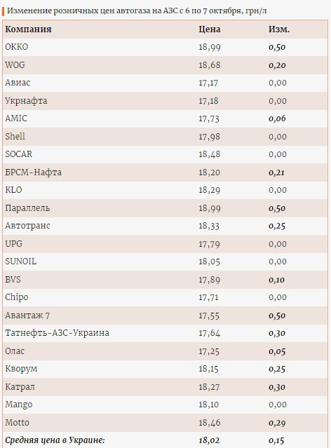 Цена ресурса в сетях премиум-сегмента побила рекорд за всю историю наблюдения. Например, OKKO выставила на стелу 18,99 грн/л (+50 коп./л), а WOG – 18,68 грн/л (+20 коп./л). В то же время, сеть автозаправок "Авантаж 7", работающая в в эконом-сегменте, подняла цену автогаза на 50 коп./л. Теперь пользователям данной сети АЗС нужно будет платить 17,77 грн/л.