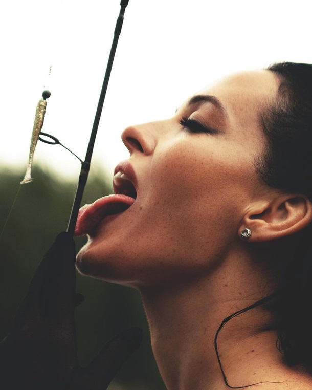 Звезда позировала в черном боди, чулках и высоких перчатках. Соблазнительный образ дополнила удочка.