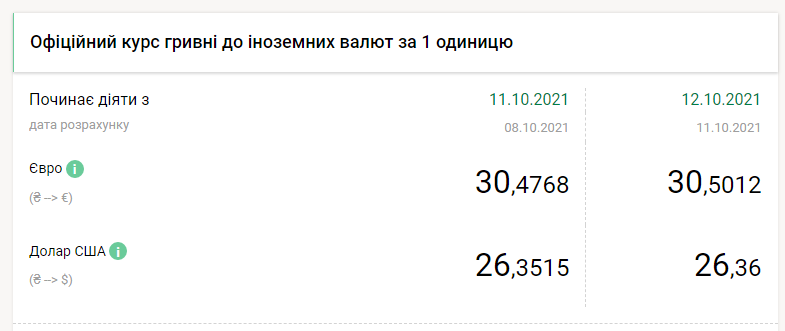 Национальный банк Украины на вторник, 12 октября, понизил курс гривны менее чем на 1 копейку по отношению к доллару и почти на 2,5 копейки к евро, передает FaceNews.ua. Об этом свидетельствуют данные на сайте НБУ.