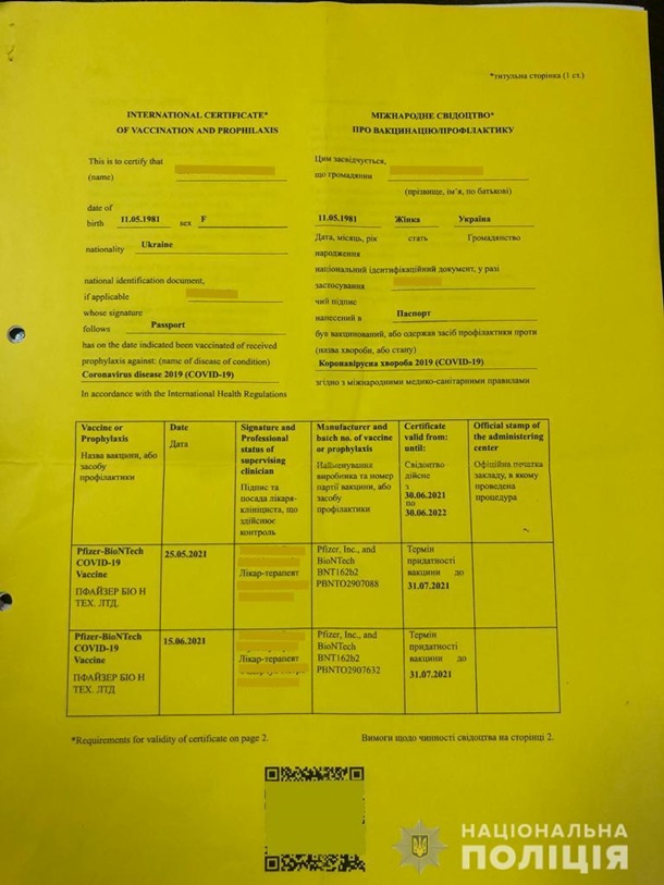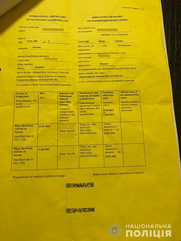 "Женщина вместе с сестрой в аэропорту пытались использовать поддельные сертификаты о вакцинации, чтобы попасть в Украину. Поддельные документы изъяты, ведется следствие", - сообщает Нацполиция