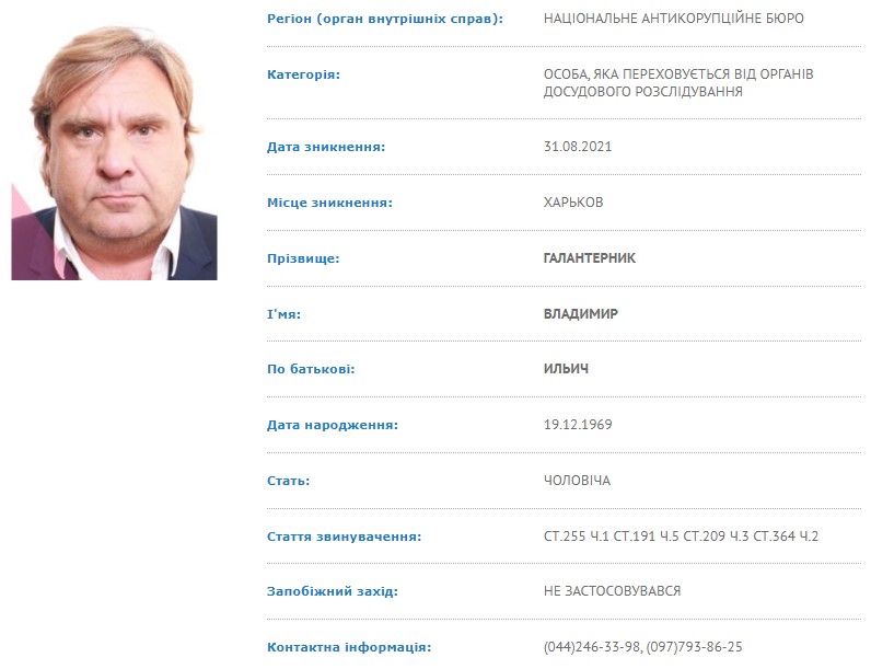 В базе указано, что НАБУ разыскивает Галантерника по статьям о создании преступной организации, злоупотреблении служебным положением, присвоении имущества и отмывании доходов в особо крупных размерах. Местом исчезновения указан Харьков.