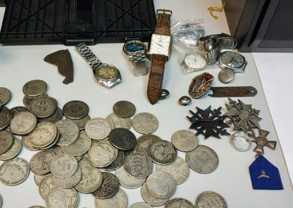 "Каски, ложки, вилки, консервный ключ, 80 монет из белого металла, пуговицы, «газбак» - емкость для хранения противогаза, фляги, бинокли, полулитровая масленка, костяные бусы с черепами, испанские кресты - знак отличия для немцев, участвовавших в Гражданской войне в Испании 1936-1939 годов, военные авиационные часы Люфтваффе, скульптурная голова Гитлера и т.д.", - сообщают сотрудники.