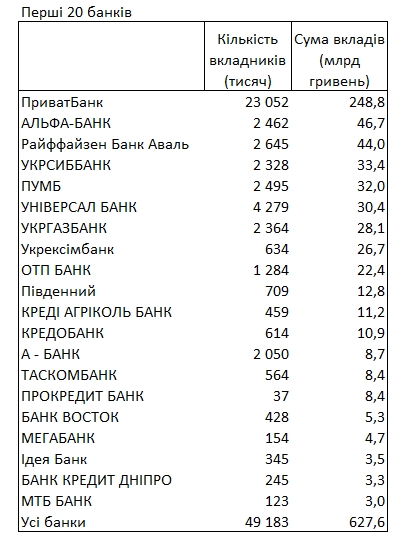 По данным НБУ, больше всего вкладов в государственном ПриватБанке - 248,8 млрд гривен. Количество вкладчиков - 23 млн 52 тысячи.