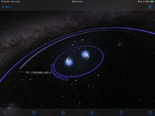 Астрономы наблюдали, как TIC 172900988b проходила через свою главную звезду, а через пять дней проходила через вторую звезду. При этом двойная система затмевала себя на 20-дневной орбите.