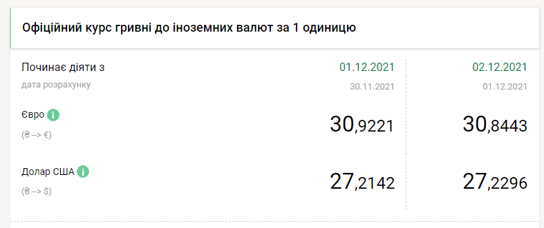 Национальный банк Украины на четверг, 2 декабря, понизил курс гривны еще на 1,5 копейки по отношению к доллару и снизил почти на 8 копеек к евро, передает FaceNews.ua. Об этом свидетельствуют данные на сайте НБУ в среду, 1 декабря.