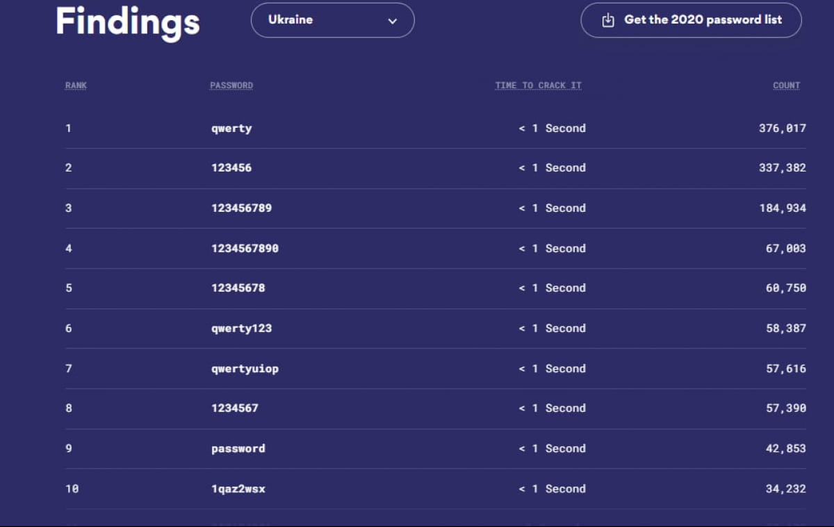 Топ-10 самых популярных паролей в Украине в 2021 году