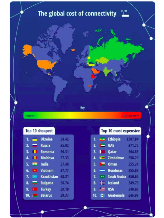 Только африканские и ближневосточные страны входят в список самых дорогих стран по стоимости интернета. На первом месте - Эфиопия, где стоимость широкополосной связи за месяц – около 11 тысяч гривен. Ценник в десять раз дороже по сравнению с Великобританией, где интернет стоит 1124 гривен.