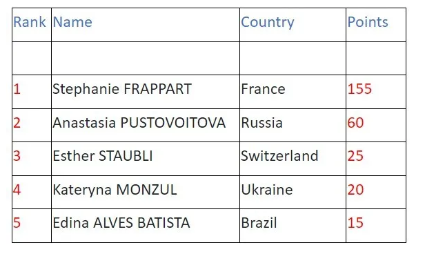 На третьей позиции оказалась швейцарка Эстер Штаубли (25), на четвертой – Монзуль (20), на пятой – Эдина Алвес Батиста из Бразилии (15).