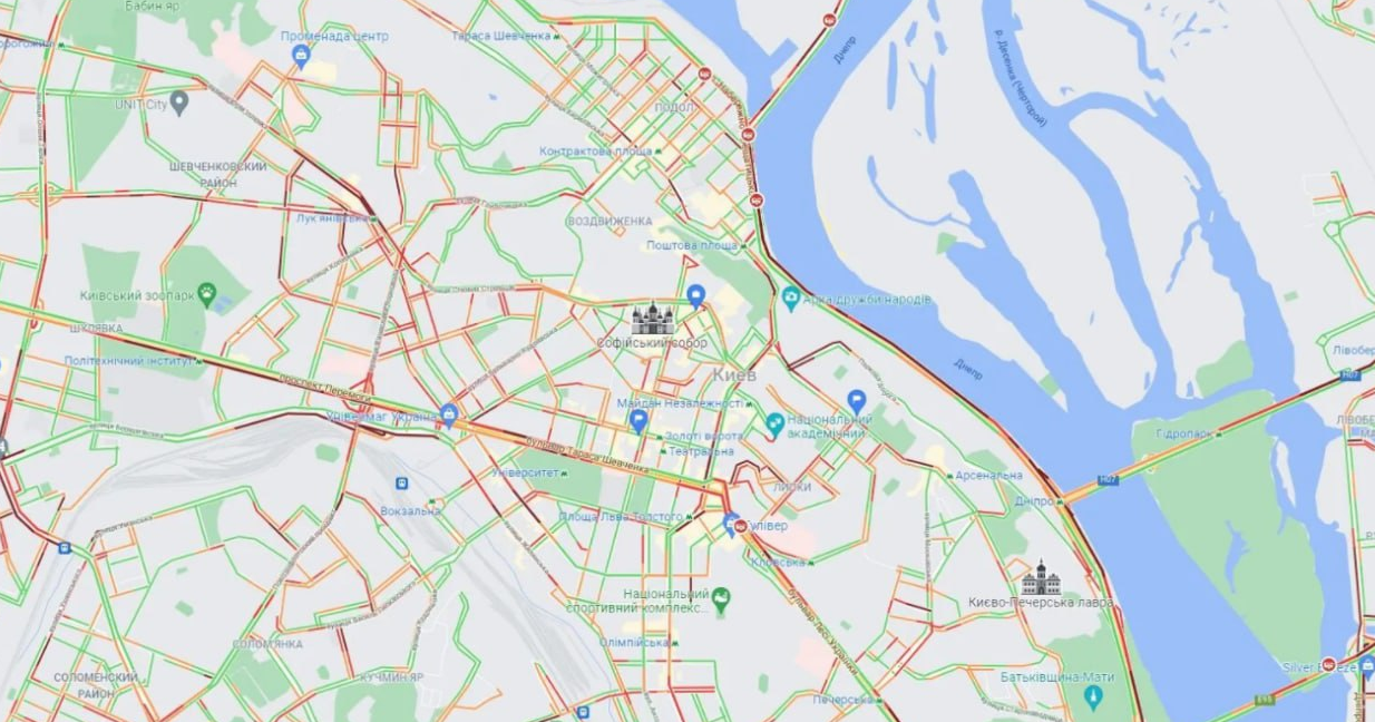 Проблемы с движением автомобилей на участке дороги от метро "Почайна" и до метро "Дорогожичи", на проспектах Победы и Леся Курбаса, Голосеевском, Академика Глушкова (от ТЦ "Новая Линия" и до ВДНХ) и Валерия Лобановского.