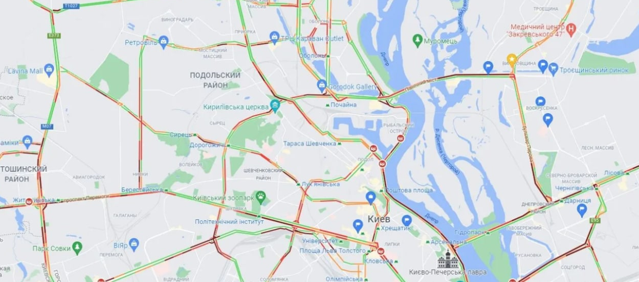 Пробки повлияли на скорость автомобилей на улицах Вадима Гетьмана (в направлении Караваевых Дач), Борщаговской, Академика Заболотного (в направлении Московского шоссе), Щусева, Юрия Ильенко, Братиславской и Данила Щербаковского.