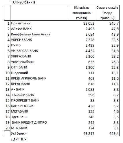 По данным НБУ, больше всего вкладов в государственном ПриватБанке - 245,7 млрд гривен. Количество вкладчиков - 23 млн 53 тысячи.