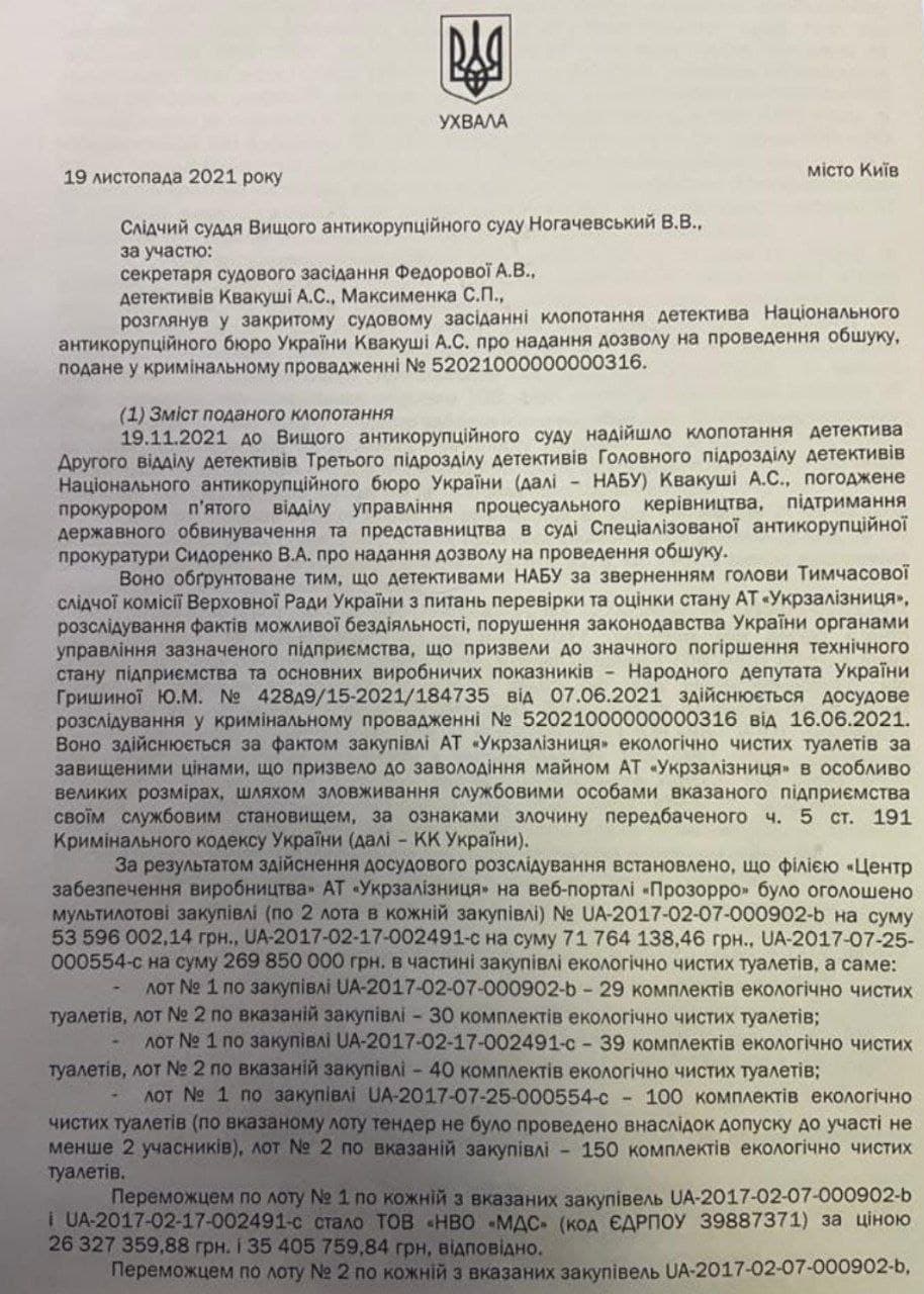 Об этом свидетельствует постановление от 19 ноября Высшего антикорсуда, куда детективы обратились в рамках уголовного производства №5202100000000316.
