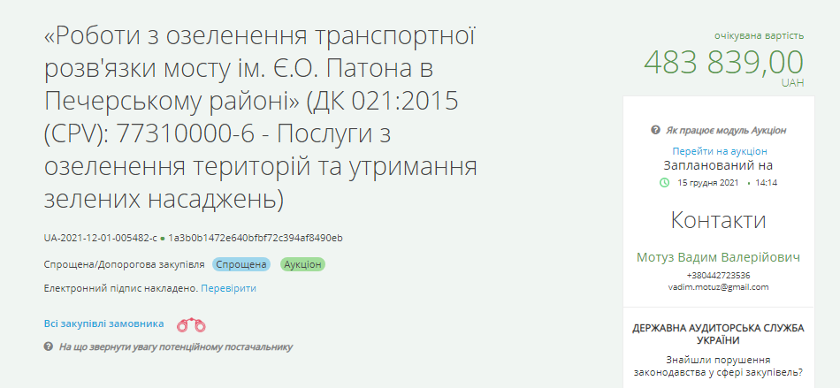 У документації зазначено, що "Київзеленбуд" планує закупити 487 ялівців та посадити їх на транспортній розв'язці моста Патона. При цьому цікаво, що термін виконання робіт – 24 грудня.