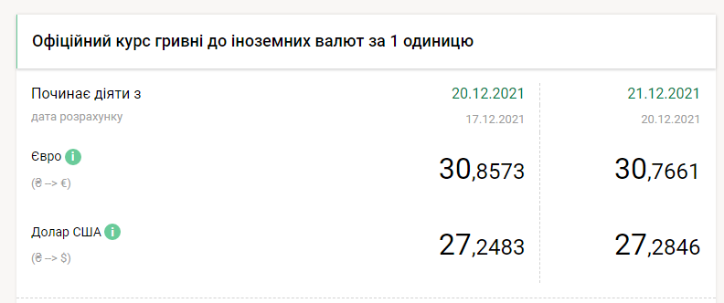 Национальный банк Украины на вторник, 21 декабря, установил официальный курс гривны к американскому доллару на уровне 27.28 грн/$, передает FaceNews.ua.