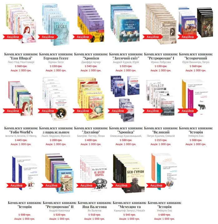 Среди комплектов книг по 1000 грн есть как классическая литература, так и издание современных авторов. С полным список можно ознакомиться по ссылке.
