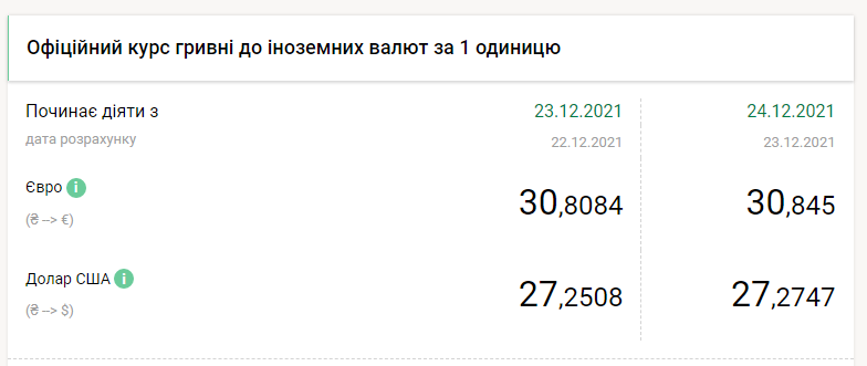 Национальный банк Украины на пятницу, 24 декабря, ослабил курс гривны на 8 копеек по отношению к доллару, и на 3 копейки к евро, передает FaceNews.ua. Об этом свидетельствуют данные на сайте НБУ в четверг, 23 декабря.