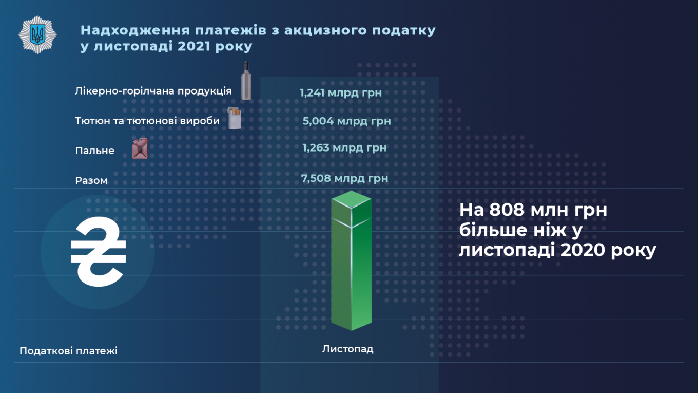 Поступления платежей по акцизному налогу на производимые в Украине подакцизные товары (ликерно-водочная продукция, горючее, табак и табачные изделия) составляли в ноябре 2021 года - 7,508 млрд грн, что на 808 млн грн больше, чем в ноябре 2020 года, сообщает пресс-служба МВД.