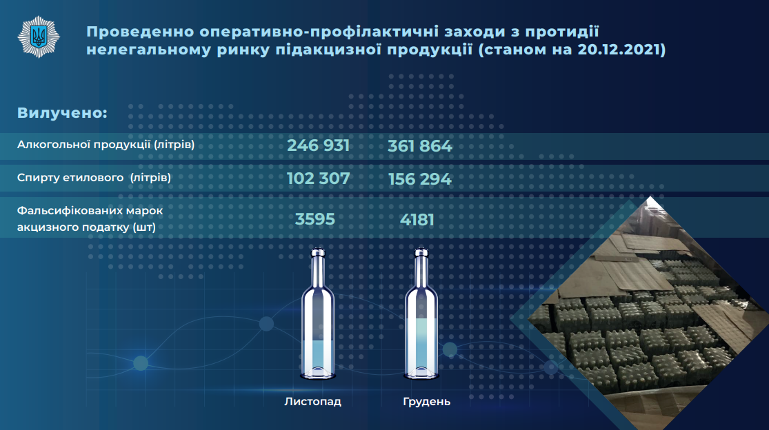 Например, в Николаевской области работники Департамента стратегических расследований Национальной полиции прекратили деятельность 4-х подпольных цехов, которые производили до 30 тонн фальсифицированных алкогольных напитков ежемесячно. По результатам полицейские задержали двух участников преступной группы в порядке статьи 208 Уголовного процессуального кодекса Украины. Трем фигурантам сообщено о подозрениях по ч. 2 ст. 204 (незаконное изготовление, хранение, сбыт или транспортировку в целях сбыта подакцизных товаров) Уголовного кодекса Украины.