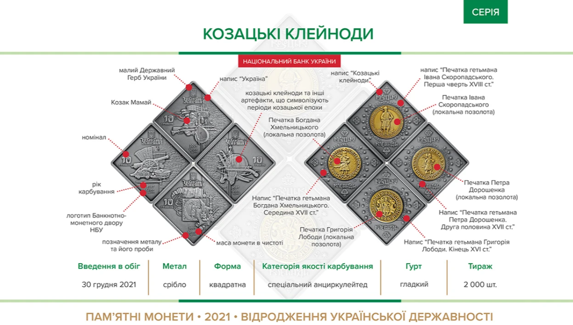 "Историческая традиция на протяжении веков определила перечень клейнодов Войска Запорожского – флаг, булава, бунчук, печать, пернач, литавры, сурьмы, каламар и т.д. Именно гетманские печати – неотъемлемые атрибуты власти гетманов Григория Лободы, Богдана Хмельницкого. Смысловой акцент набора монет и представляют казацкие сутки от ее зарождения до сумерек и олицетворяют мощные исторические пласты", - говорится в сообщении пресс-службы.